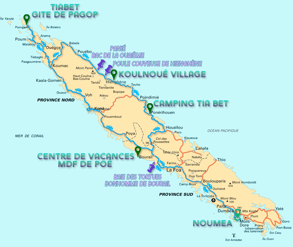 Ensuite Koumac, Tiabet, Poum, puis tout au bout d’une route, hum, hum, comment dire, une piste en fait, nous arrivons au Gite de Pagop, notre première étape.